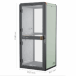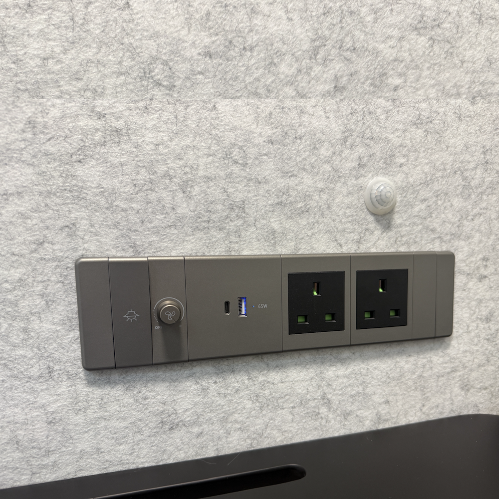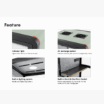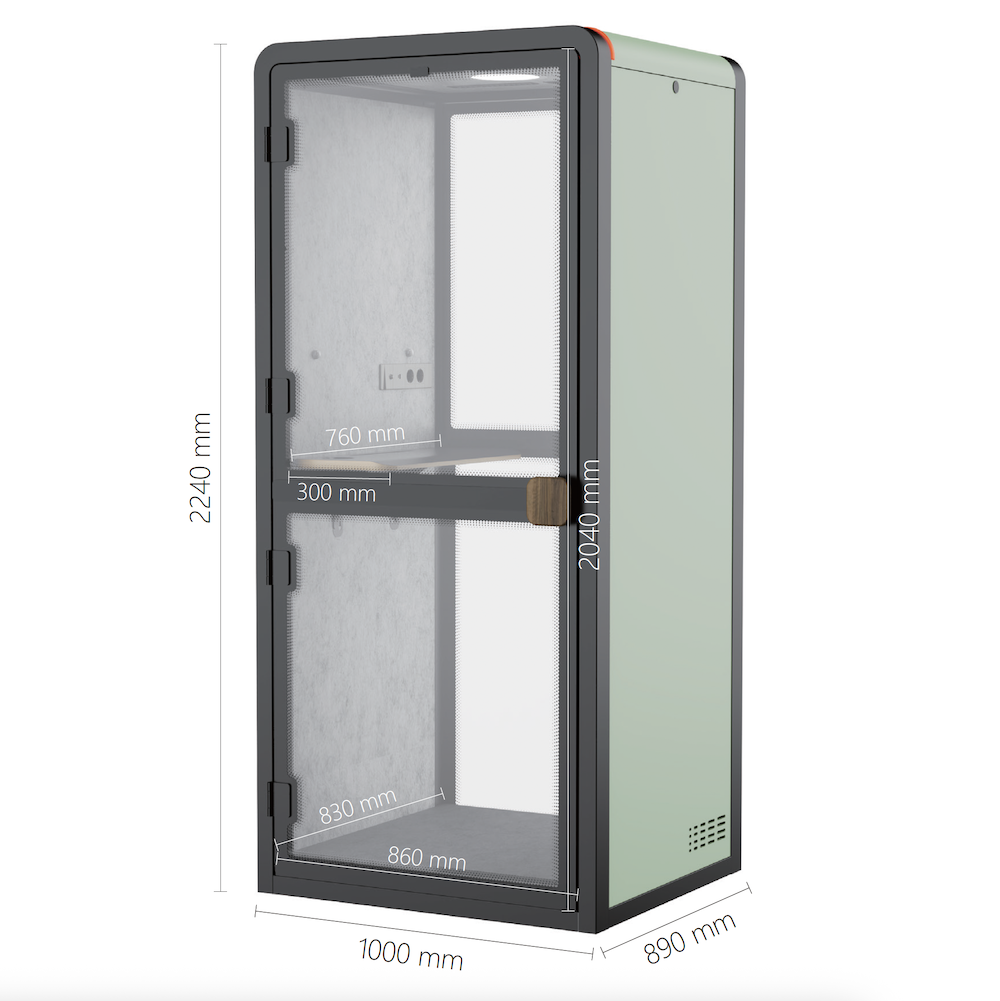 With a compact footprint and premium finishes, this acoustic pod blends seamlessly into modern office layouts. Inside, you’ll find ergonomic comfort, integrated power and data ports, and a well-ventilated, well-lit environment that supports extended use.