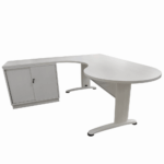 Modern L-shaped office desk, white epoxy metal legs & modesty panel, lockable cabinet. Dimensions: 1800mm x 1800mm. Available in left or right configurations.